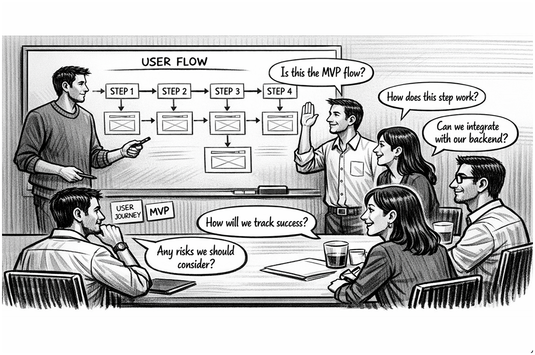 User flow is created and validated, and technical dependencies identified. Cross-functional teams validate assumptions and refine scope.